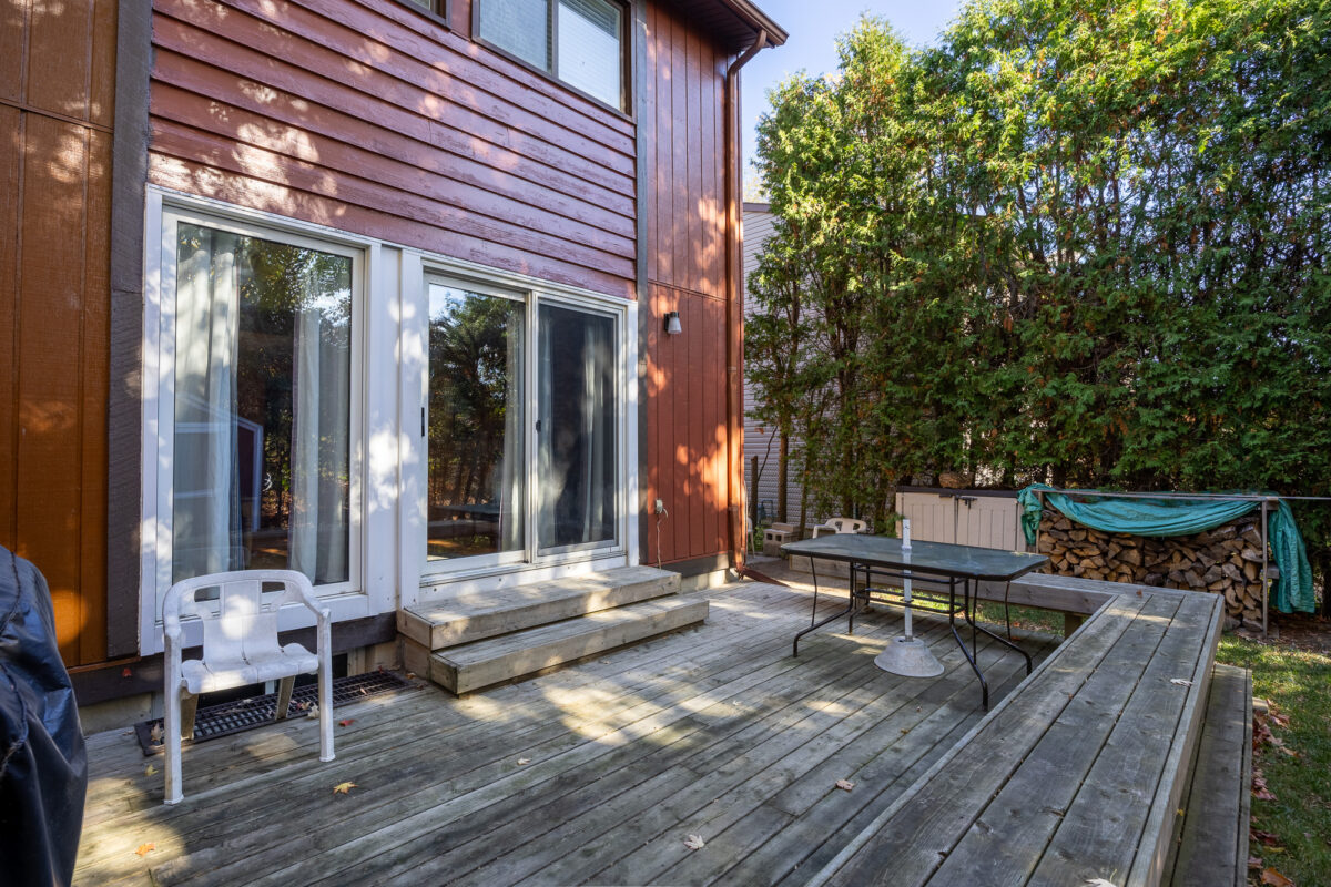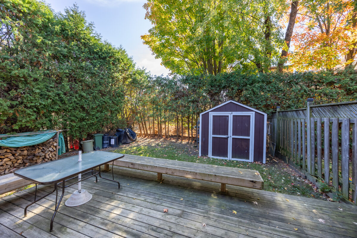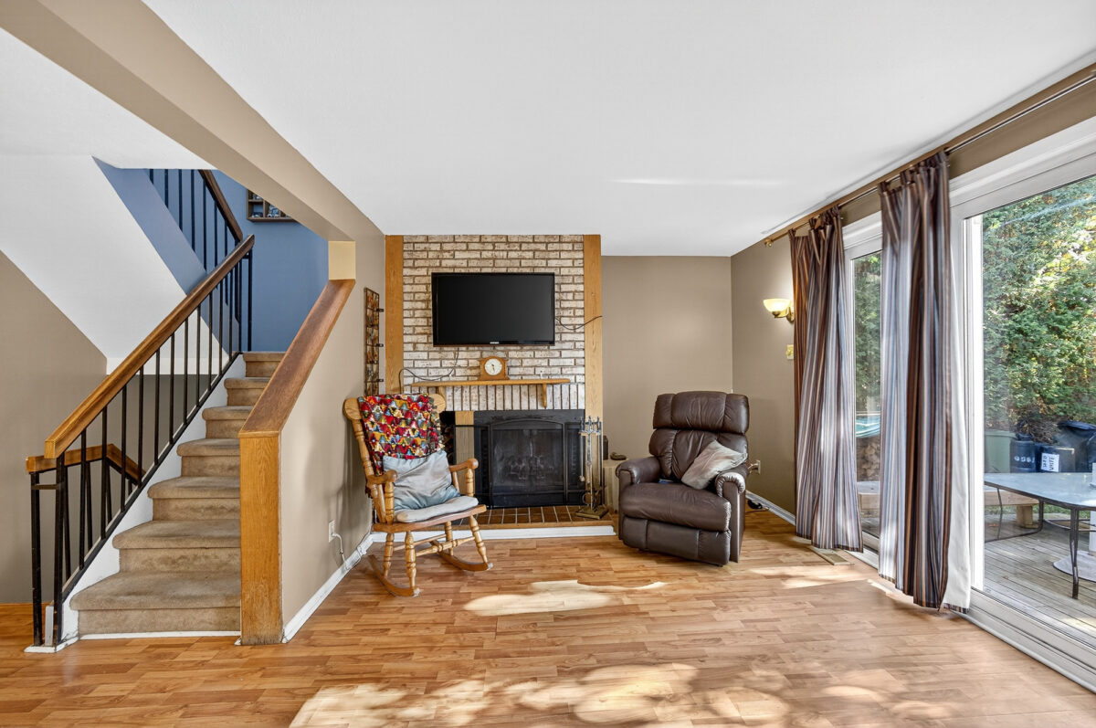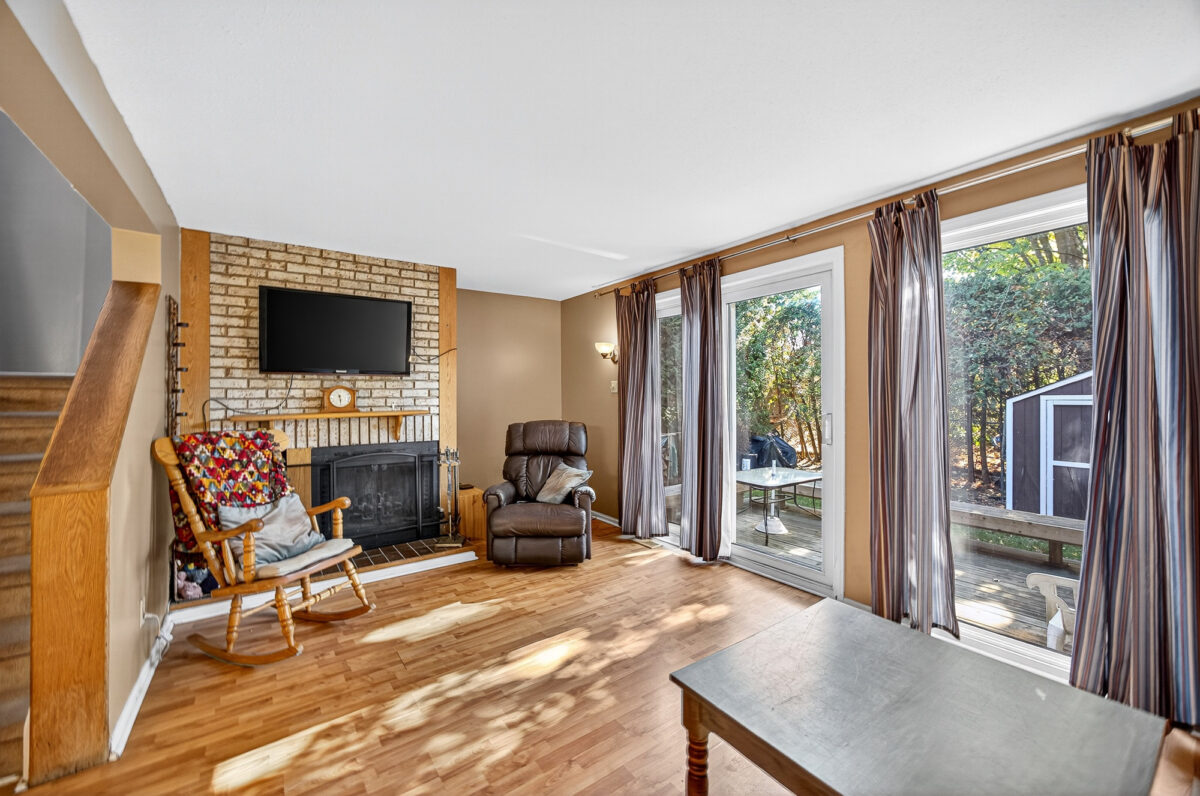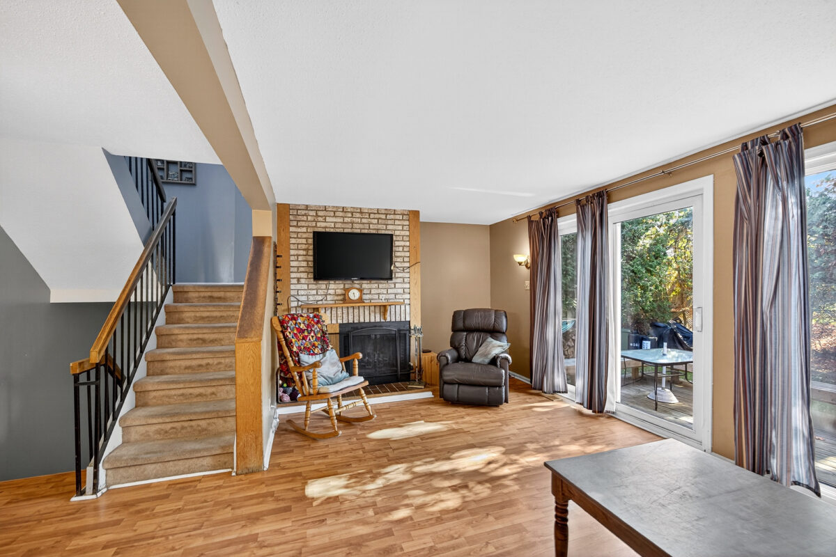 he living and dining rooms offer an easy flow for everyday living and entertaining, with wood fireplace, large windows and a patio door leading to a private backyard complete with a deck and storage shed — ideal for summer BBQs or peaceful evenings outdoors.