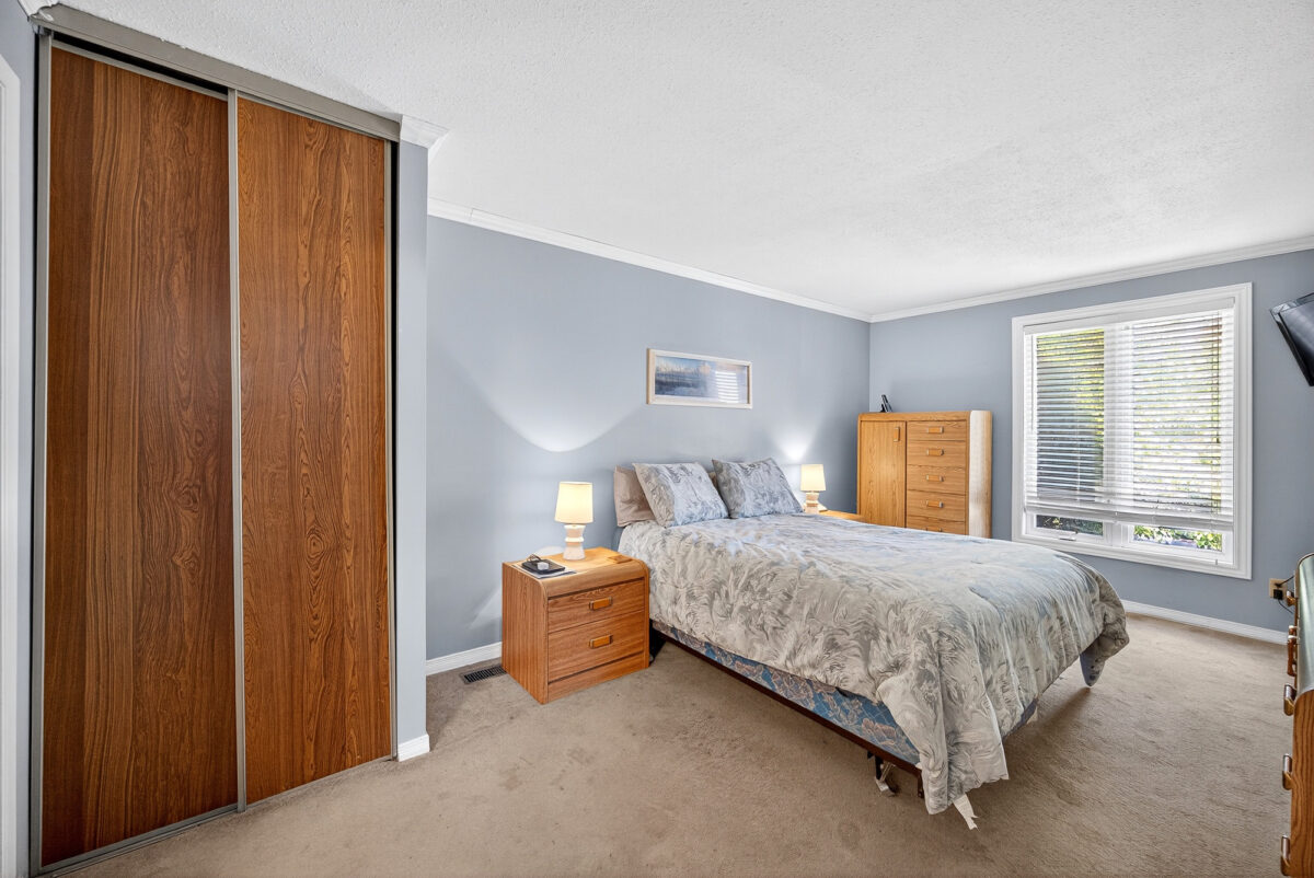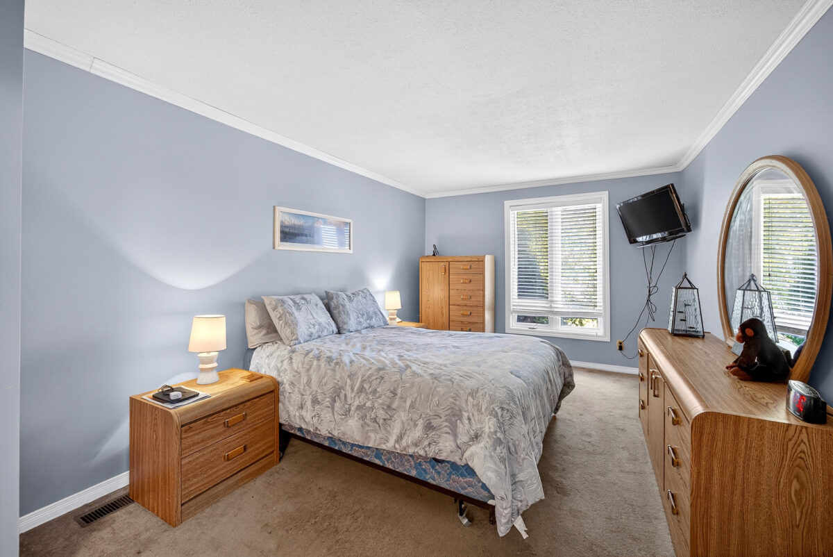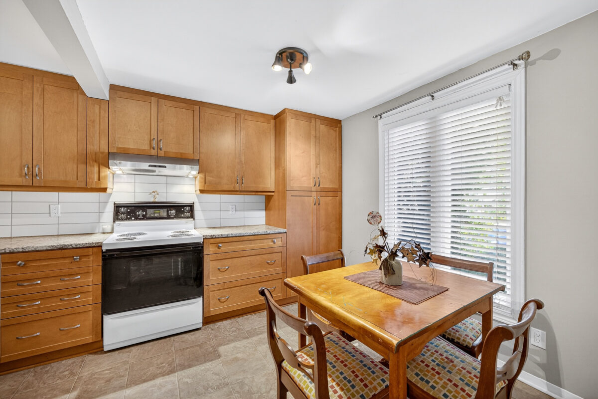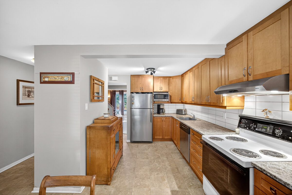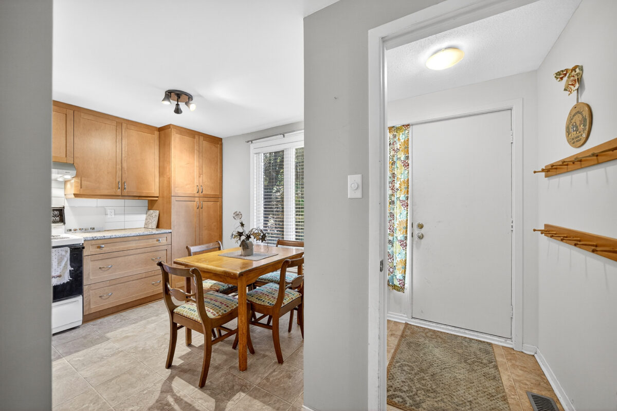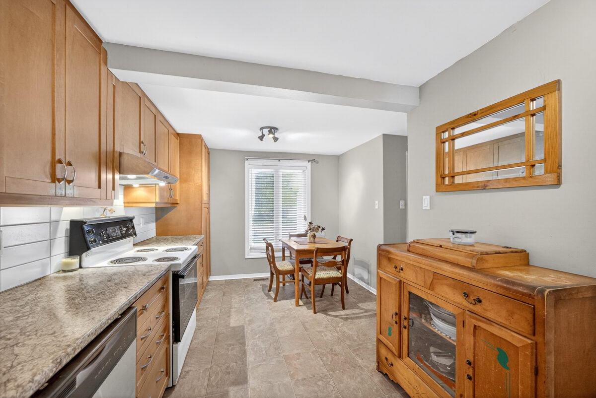 he living and dining rooms offer an easy flow for everyday living and entertaining, with wood fireplace, large windows and a patio door leading to a private backyard complete with a deck and storage shed — ideal for summer BBQs or peaceful evenings outdoors.