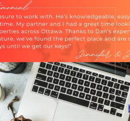 “Dan was remarkable throughout the entire house search and purchase experience. He started with determining what we are looking for. Over the course of the search, he was patient, understanding that we will need to see a variety of places to establish our final list of wants and needs, and was both courteous but honest when he thought something was not a good value. Note that Dan is very knowledgeable about house construction through the decades, as well as different areas within and around Ottawa. He is also very pragmatic and shrewd when it comes to reading the market.