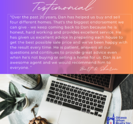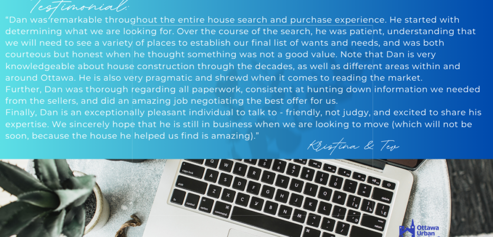 “Dan was remarkable throughout the entire house search and purchase experience. He started with determining what we are looking for. Over the course of the search, he was patient, understanding that we will need to see a variety of places to establish our final list of wants and needs, and was both courteous but honest when he thought something was not a good value. Note that Dan is very knowledgeable about house construction through the decades, as well as different areas within and around Ottawa. He is also very pragmatic and shrewd when it comes to reading the market.